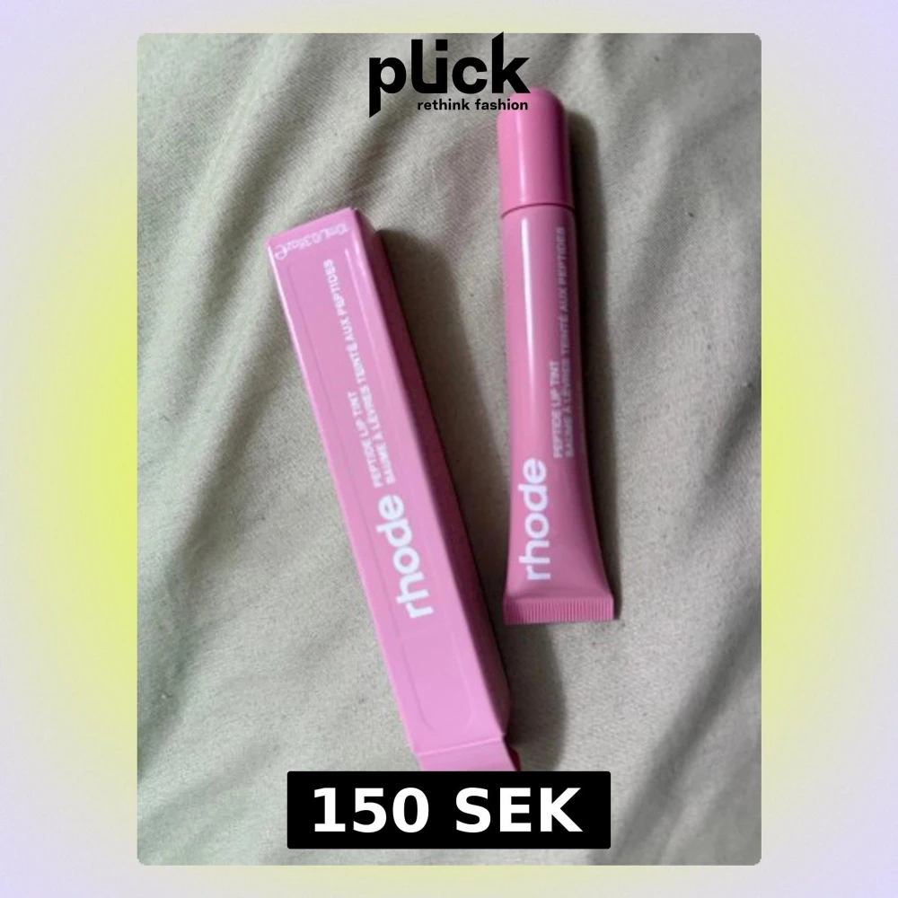 Säljer en Rhode Peptide Lip Tint i färgen Ribbon. Tuben och förpackningen är i en snygg ljusrosa nyans med vit text. Produkten är en läppbalsam med tint, perfekt för att ge läpparna en mjuk rosa ton och extra fukt. Kommer i en praktisk plasttub.