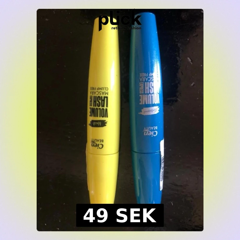Två volymmascaror från Cien Beauty, en i gul förpackning med svart färg och en i blå förpackning med waterproof formula. Båda har en klumpfri formula och kommer i snygga, rundade tuber som är enkla att hålla i.