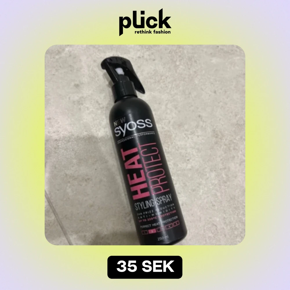 Säljer en flaska Syoss Heat Protect Styling Spray. Den skyddar håret mot värme upp till 220°C och minskar friss. Perfekt för att hålla håret snyggt och skyddat när du stylar det med värmeverktyg. Flaskan innehåller 250 ml.