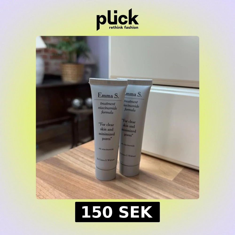 Två tuber av Emma S. Treatment Niacinamide Formula, designade för klarare hud och minimerade porer. Innehåller 6% niacinamide och är lämplig för alla hudtyper. Varje tub rymmer 30 ml.