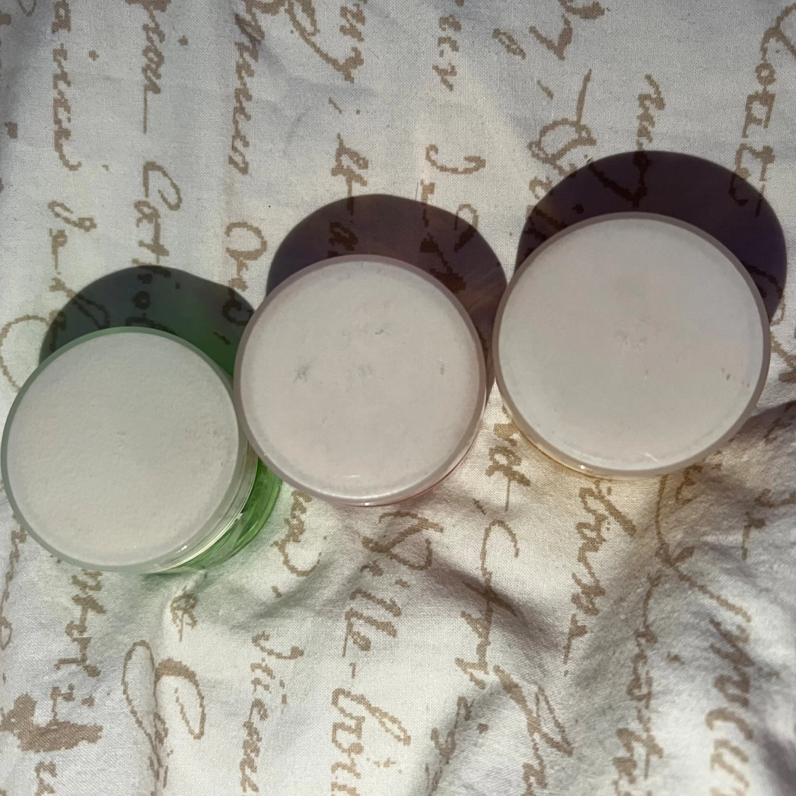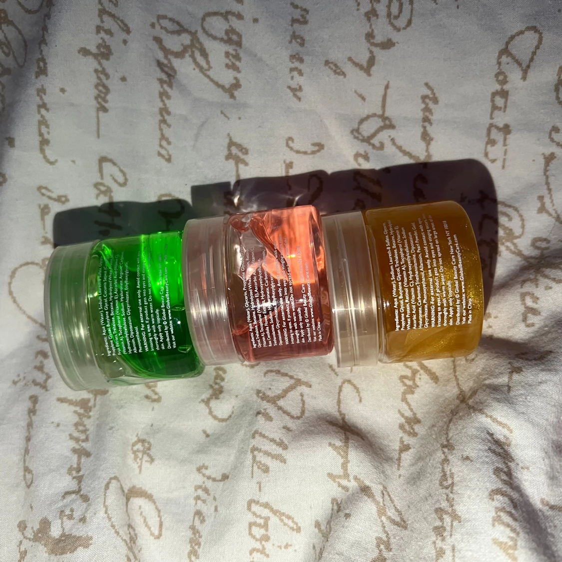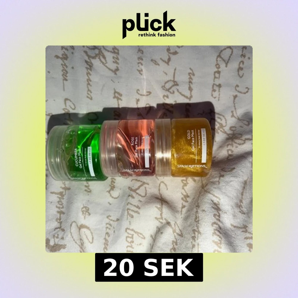 Tre gel face masks från Spascriptions i burkar om 50 ml. En grön med gurka, en rosa med ros och en guldig med glitter. Perfekt för dig som vill testa olika ansiktsmasker med fräscha dofter och snygga färger. Burkarna är genomskinliga plast med vita lock.