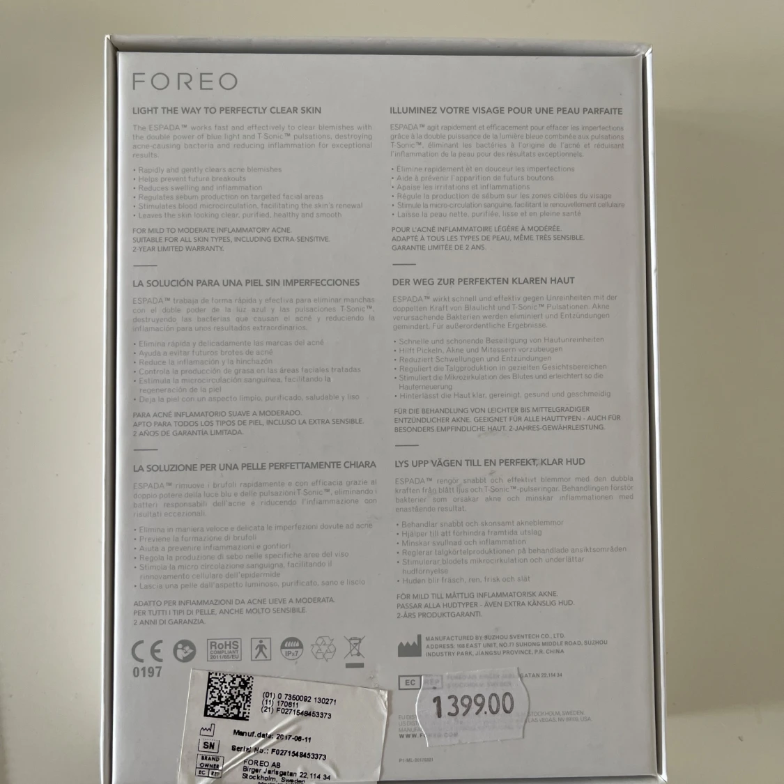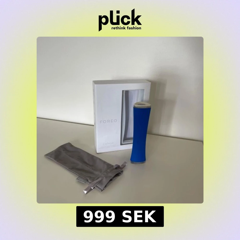 En blå Foreo Espada, ett elektriskt verktyg för ansiktsbehandling med LED-ljus. Kommer med originalförpackning och en grå förvaringspåse i tyg. Perfekt för hudvård och punktbehandling av orenheter.