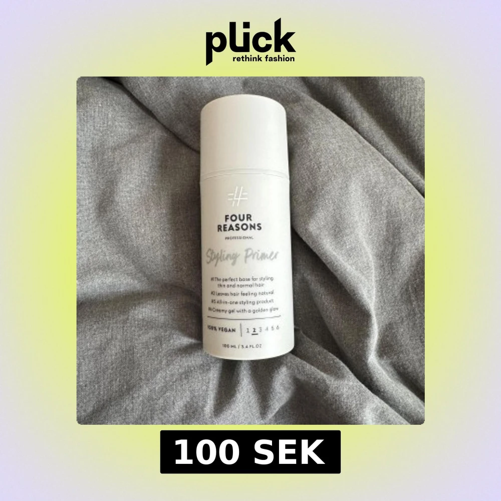 En vit flaska med Styling Primer från Four Reasons Professional. Produkten är en vegansk primer i gel-form, perfekt som bas för styling av tunt och normalt hår. Innehåller 100 ml och ger en naturlig känsla med en golden glow.