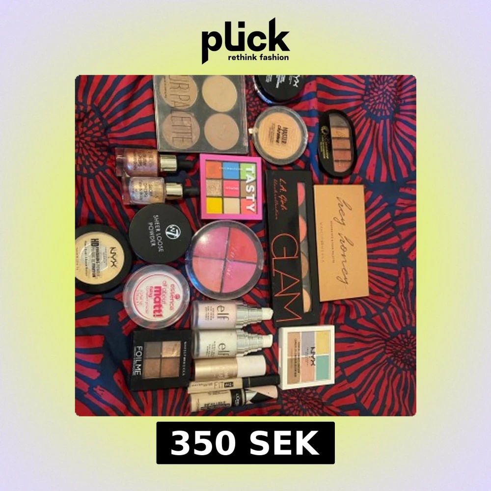 Ett varierat sminkset med flera paletter och produkter från märken som NYX, e.l.f., och W7. Innehåller ögonskuggspaletter i olika färger, foundations, highlighter, och puder. Perfekt för att skapa olika sminklooker.