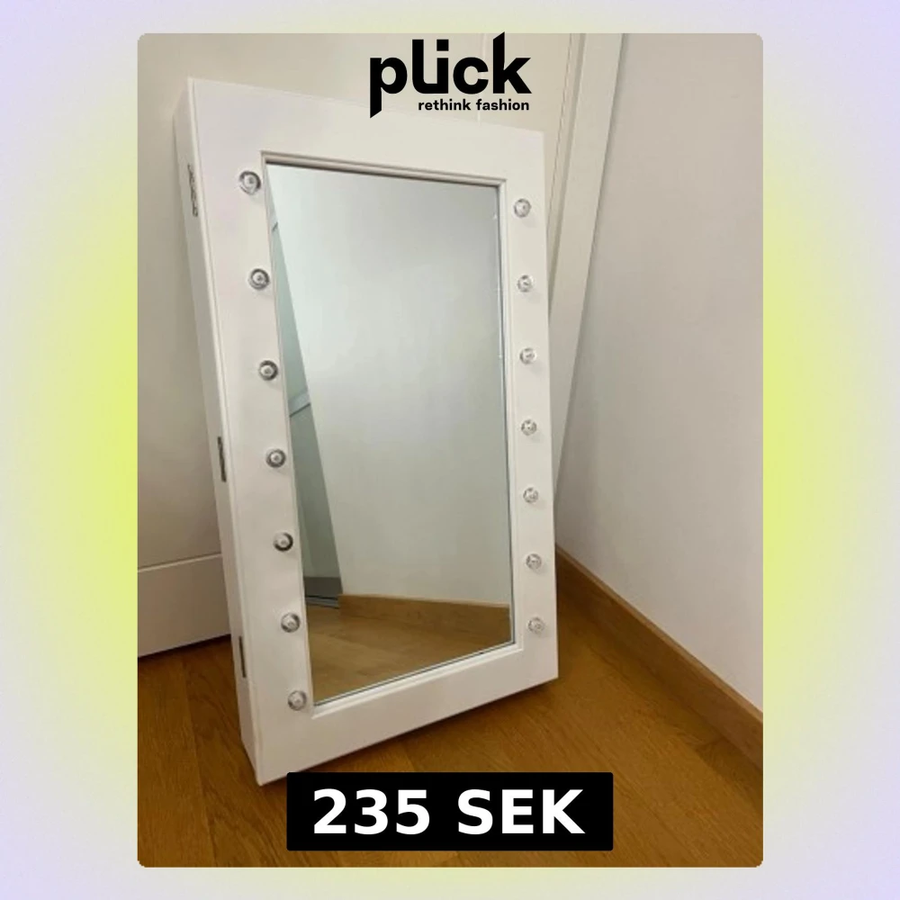 Snygg sminkspegel i vitt med inbyggd LED-belysning runt spegeln. Spegeln har ett skåp med svart inredning och flera krokar och hyllor för smink och accessoarer. Perfekt för att organisera dina produkter. Man behöver skruvar för att hänga upp den, och batterier.