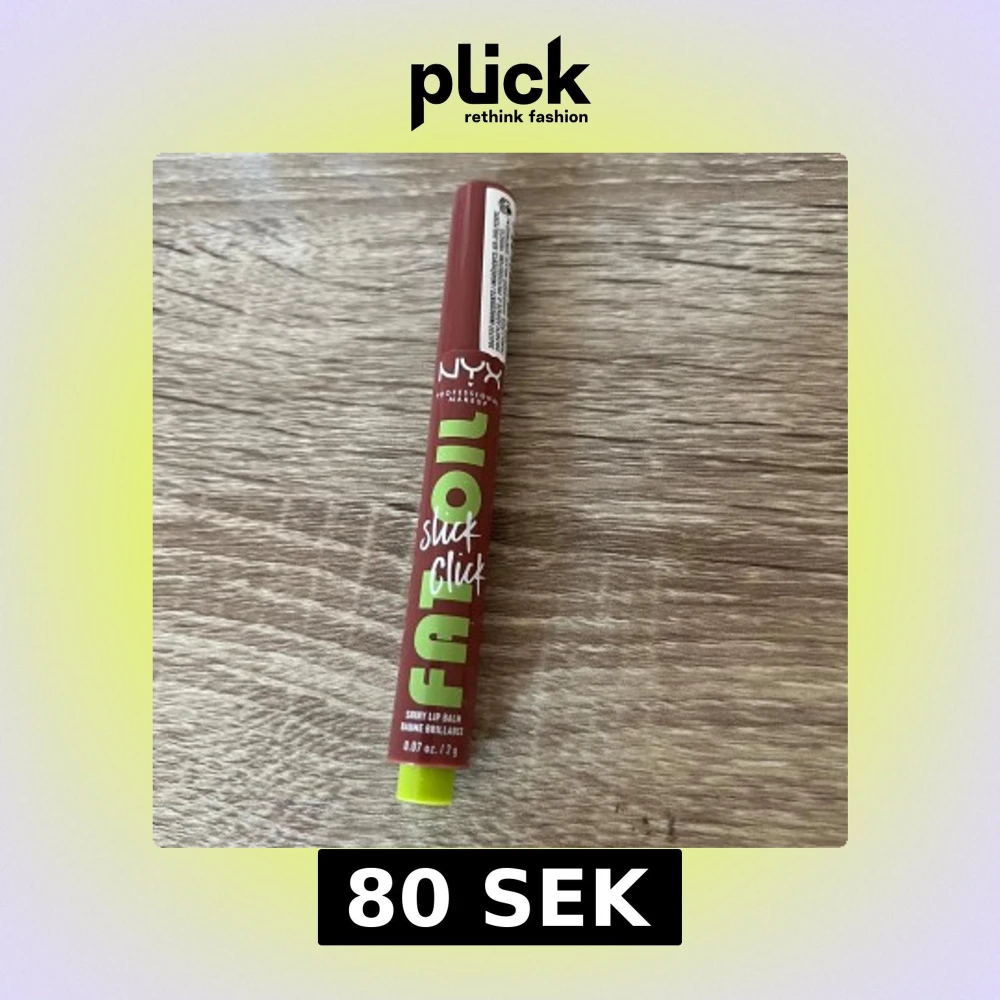 Endast swatchad, NYX Fat Oil Slick Click Shiny Lip Balm i en brunröd nyans. Stiftet har en smidig klickmekanism och ger glansiga, återfuktade läppar. Perfekt för dig som vill ha både färg och glans i ett. Kommer i en praktisk tub med limegröna detaljer.
