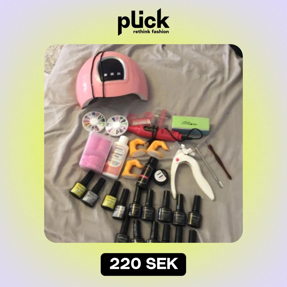 Säljer nagelkit med top & base coat, 11 gellack, nail wipes, nagelsax, nagelbandskniv, 3 övningsfingrar, 2 paket stenar, 3 bitar till elfil, elfil, block med buff & fil, dammborste, soak off solution, nail extender (hård gelé för naglar) och UV-lampa