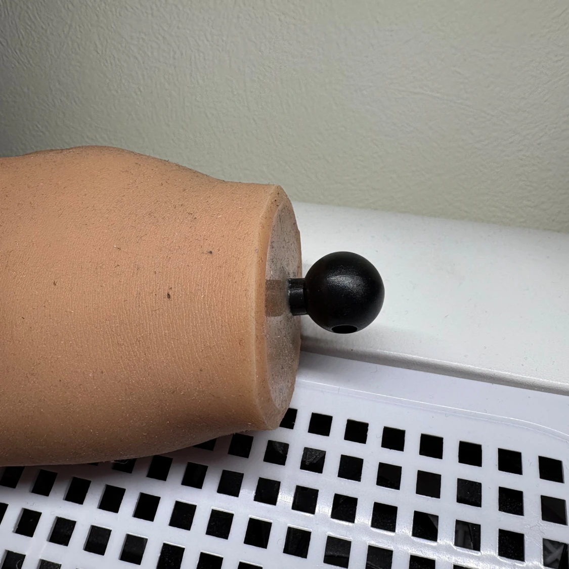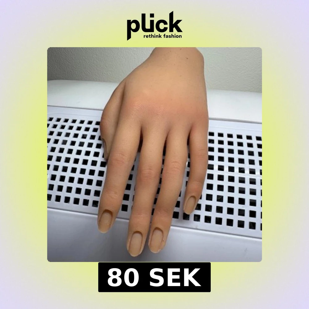 Realistisk träningshand i silikon för nagelövning, komplett med monteringsstativ och sugpropp. Perfekt för manikyrträning och salongsutbildning. Handen har lätt slitage och några små märken, men är fullt funktionell och stabil vid användning.