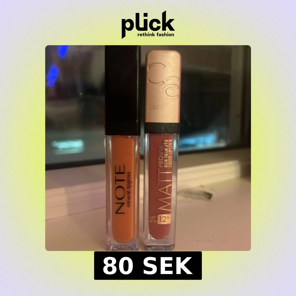 Säljer två läppglans: ett från Note i en varm orange nyans och ett matt läppglans från Catrice i en rosa ton. Perfekta för att ge läpparna en snygg finish med lång hållbarhet.