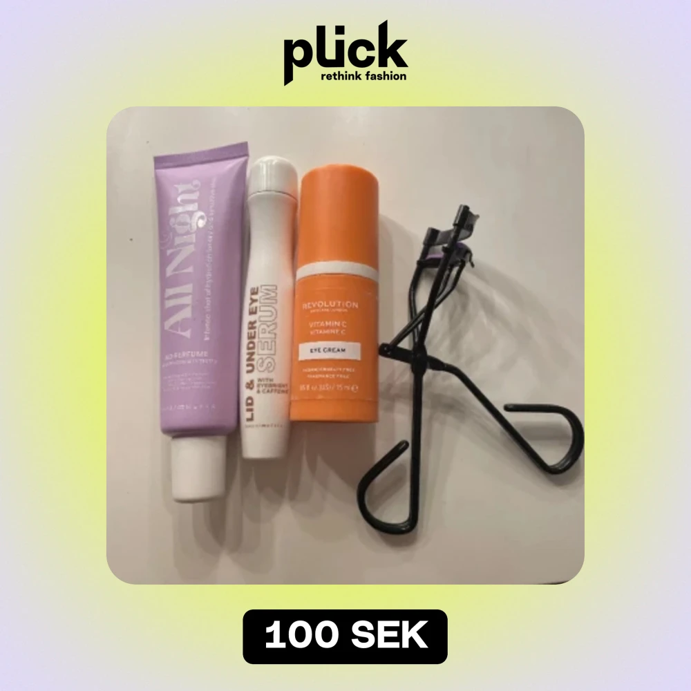 Ett litet hudvårds kit. Ögonkräm-makeup Mekka Nattkräm-makeup Mekka Ögonkräm-revolutionen Ögonfransböjare-catrice