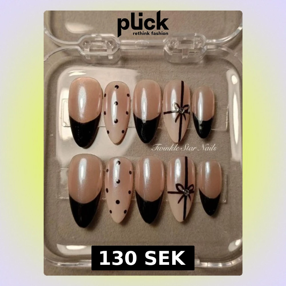Skriv gärna vid frågor, pris, storlek och design kan diskuteras! Snygga lösnaglar i nude med svart fransk tipp, prickar och rosett-design. Perfekt för att skapa en trendig och elegant look.