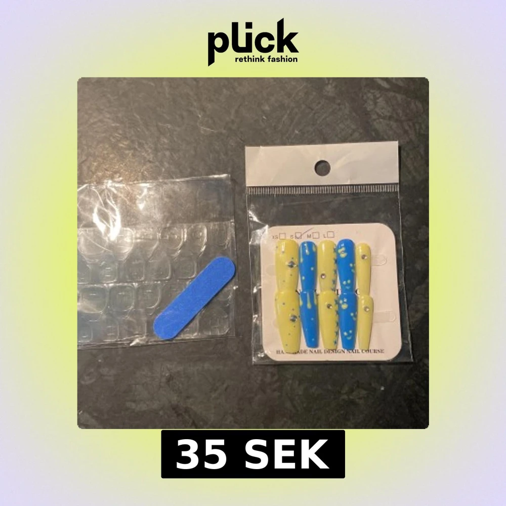 Säljer ett set lösnaglar i mixade färger – blått och gult med vita och silverfärgade prickar. Medföljer gör en blå nagelfil och självhäftande nageltejp för enkel applicering. Perfekt för dig som vill ha en unik och färgstark nageldesign.