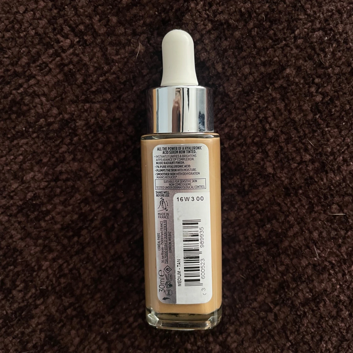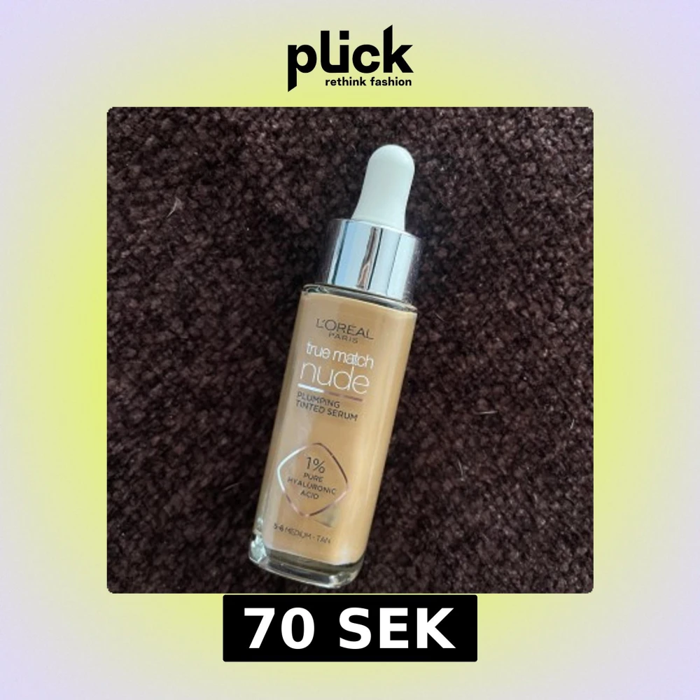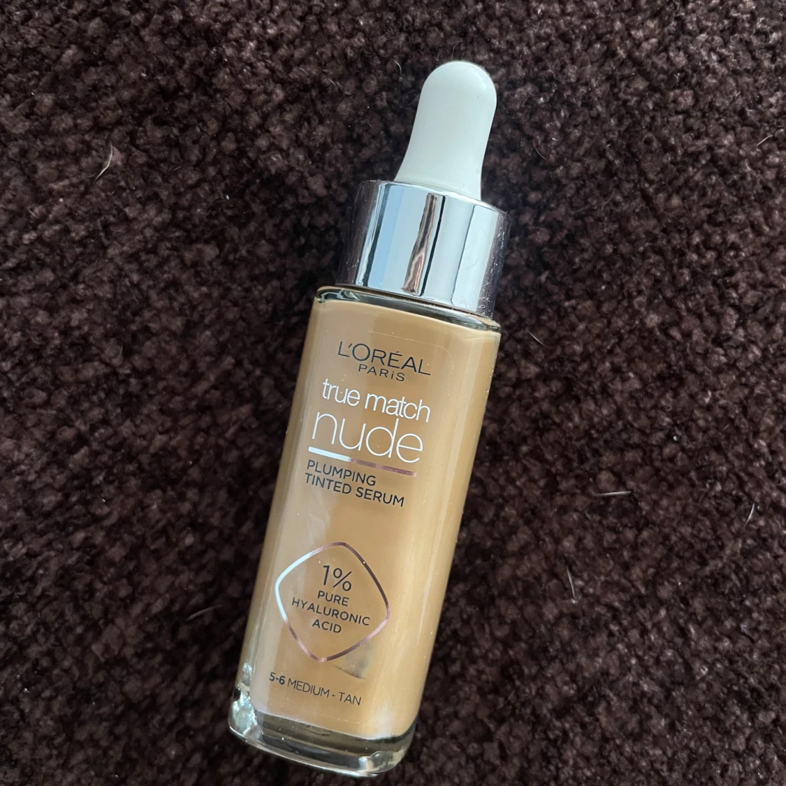 L'Oréal Paris True Match Nude Plumping Tinted Serum i nyansen 5-6 Medium Tan. Flytande foundation med pipett och 1% hyaluronsyra för återfuktande effekt. Aldrig använd, helt ny.