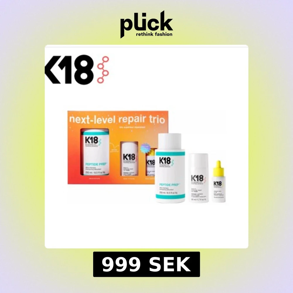 K18 next-level repair trio innehåller tre produkter i vita och färgglada förpackningar: Peptide Prep schampo, leave-in molecular repair hair mask och molecular repair oil. Helt oöppnad. Ordinarie pris: 1200kr