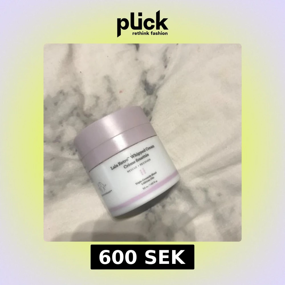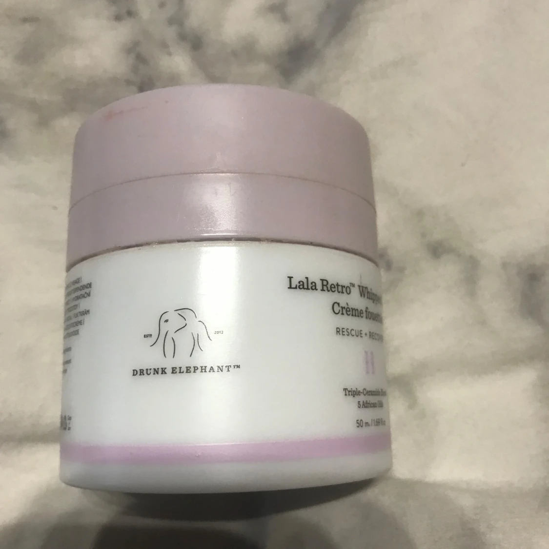 En lyxig ansiktskräm från Drunk Elephant, Lala Retro Whipped Cream, i en stilren burk med ljust lila lock. Innehåller 50 ml och är designad för att återfukta och återställa huden med en rik och krämig konsistens.
