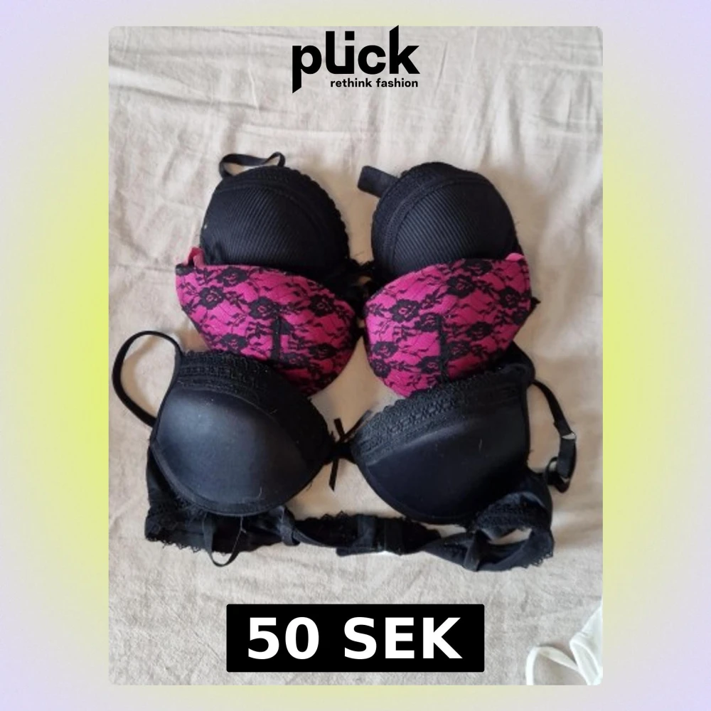 Säljer tre bhar, två i helsvart med spetsdetaljer och en i rosa med svart spetsmönster. Alla har vadderade kupor och justerbara axelband. Perfekta för dig som gillar snygga och bekväma underkläder med lite extra detaljer. Översta är i stl 75A mitten i stl 75B sista i stl 75B. 50kr st. Alla är även push up.