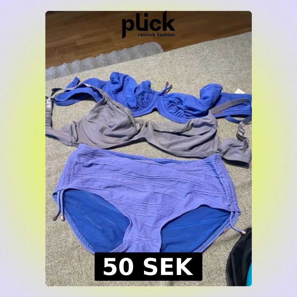 Säljer en bikini i två delar, överdelen är blå och grå med bygel och justerbara axelband. Klassisk modell med enkel design, perfekt för stranden eller poolen. Materialet känns mjukt och följsamt mot huden. Trasigt spänne på blå toppen se bild, sitter en lösning som har funkat flera gånger