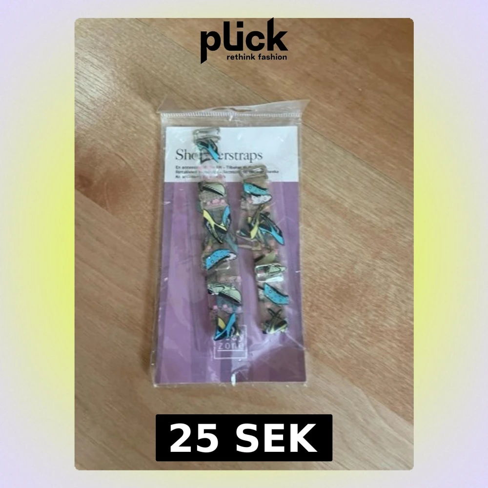 Säljer ett par transparenta axelband till BH, perfekta när du vill ha axelbandslöst utseende men ändå stöd. Axelbanden är justerbara och har dekorativa detaljer i flera färger som blått, gult och svart. Passar de flesta bhar med avtagbara axelband.