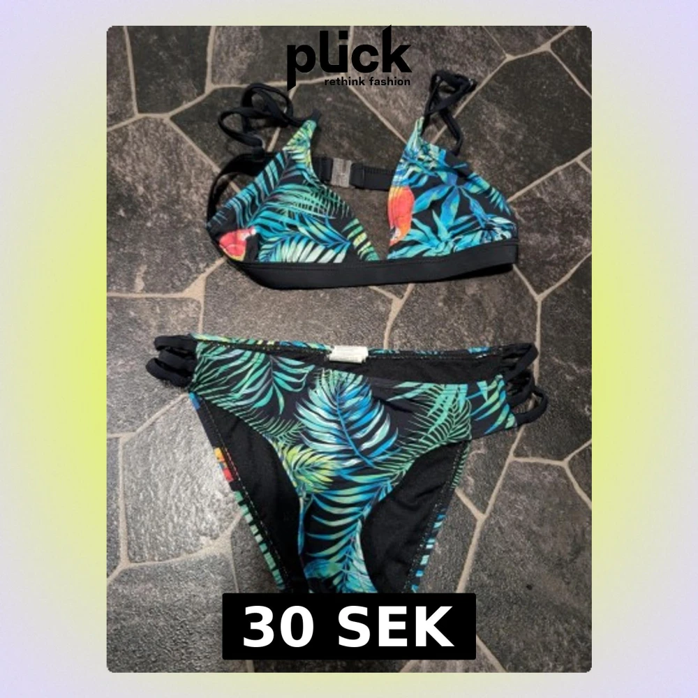Snygg bikini med tropiskt mönster i grönt, blått och inslag av rött och gult. Både överdel och underdel har svarta detaljer och flera smala band i sidorna. Bikinin har papegojor och palmblad på svart botten, vilket ger en färgstark och somrig look.
