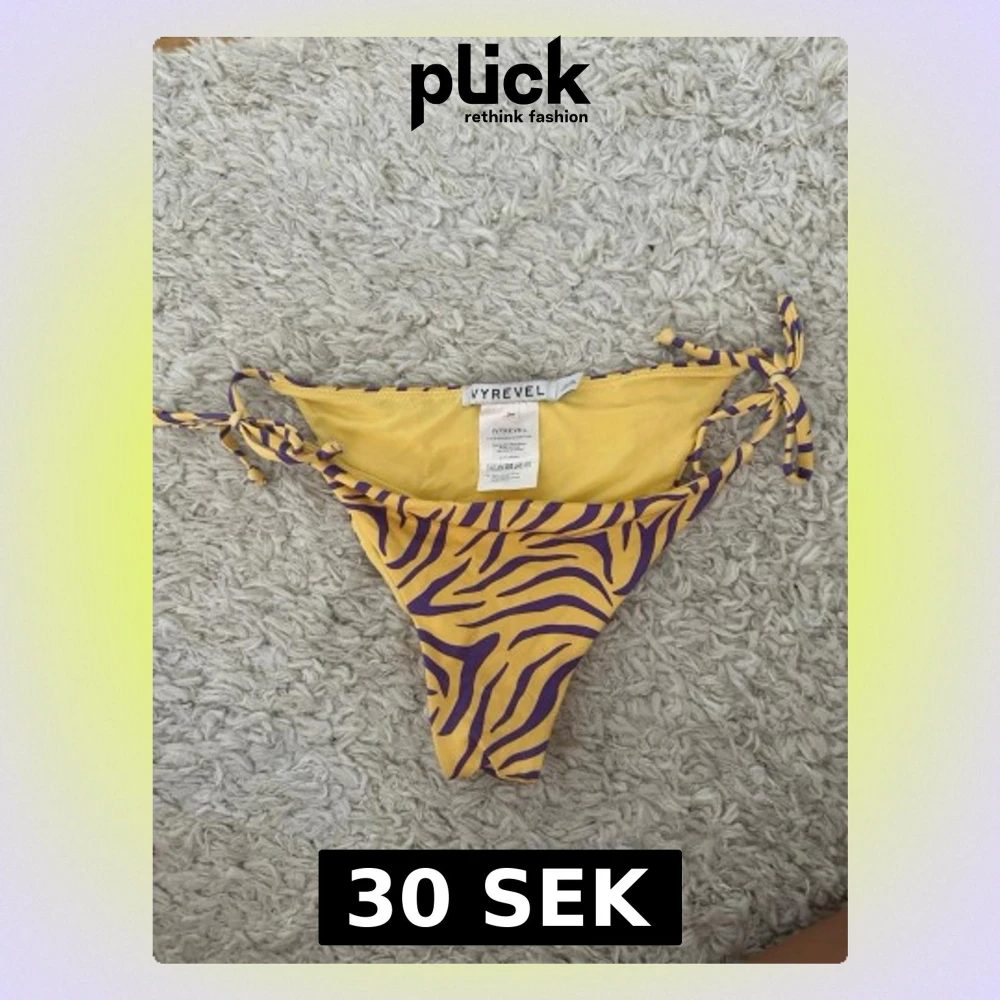 Säljer en snygg bikiniunderdel från Ivyrevel i storlek 34. Den är gul med lila zebramönster och har knytband i sidorna för perfekt passform. Materialet är mjukt och stretchigt, perfekt för strandhäng eller poolparty.