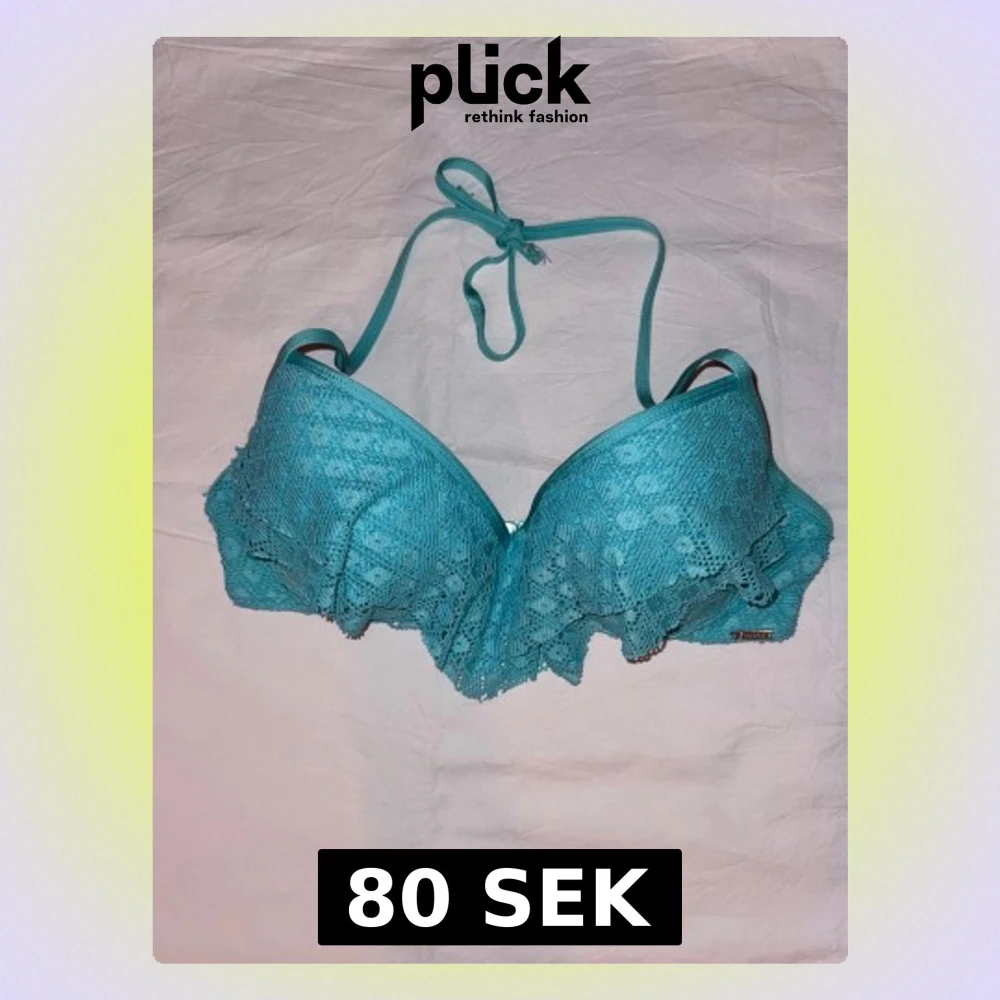 Snygg turkos bikiniöverdel med vadderade kupor och volangdetaljer i spets. Knytband i nacken för justerbar passform. Perfekt för strandhäng och poolparty. Materialet känns mjukt och bekvämt mot huden.saknar tyvärr lapp men skulle säga att den passar 70/75