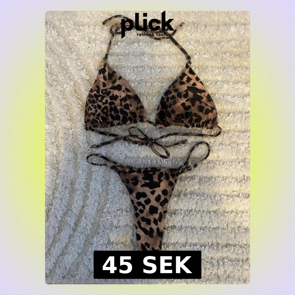 Trendig bikini med leopardmönster. Triangeltopp med knyt i nacke och rygg samt matchande trosa i stringmodell båda delarna i storlek XS ej använd bara testad