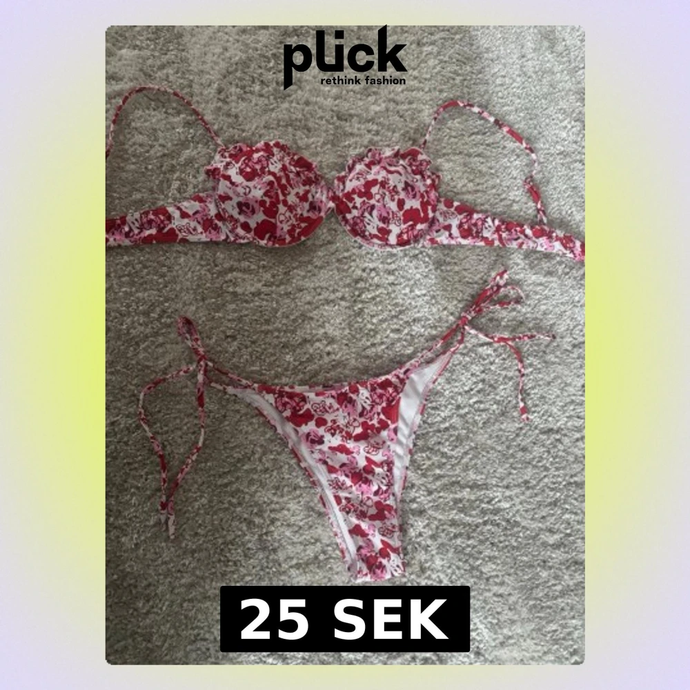 Säljer en söt bikini med blommigt mönster i rosa och vitt. Överdelen har vadderade kupor och volangdetaljer, knytes bak, medan underdelen har knyt i sidorna för justerbar passform.