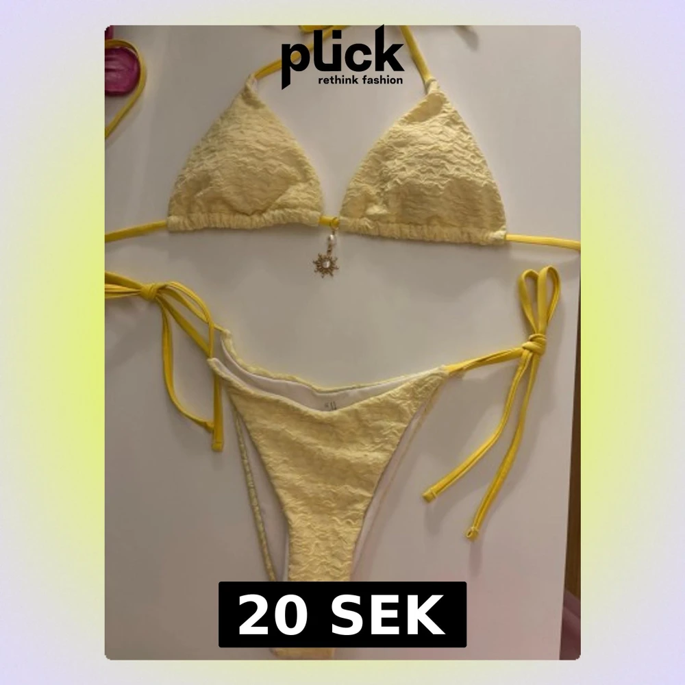 Söt gul bikini med knyt i sidorna samt i nacken. Överdelen har trekantsform och ett solformat smycke framtill med tunna band för justerbar passform. Perfekt för strandhäng och soliga dagar! Den är oanvänd.