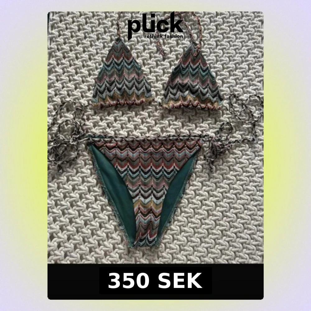 Säljer en snygg trekantsbikini med zigzagmönster i grönt, vitt, gult och rosa. Både överdel och underdel har knytband i sidorna och nacken. Bikinin har en cool retrovibe och är perfekt för stranden eller poolen. Köpt på en marknad i marbella!