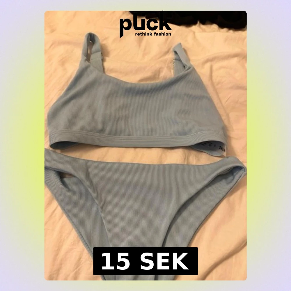 Säljer en ljusblå bikini från Shein med ribbad struktur. Överdelen har breda axelband och en enkel, sportig form med justerbara band och spänne i ryggen. Underdelen är klassiskt skuren och matchar toppen perfekt. Perfekt för strandhäng!