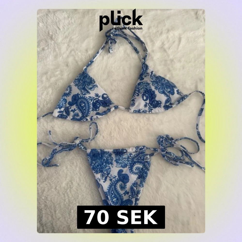 Snygg trekantsbikini i blått och vitt med paisleyinspirerat mönster. Både överdel och underdel har knytband för justerbar passform. Perfekt för stranden eller poolen!