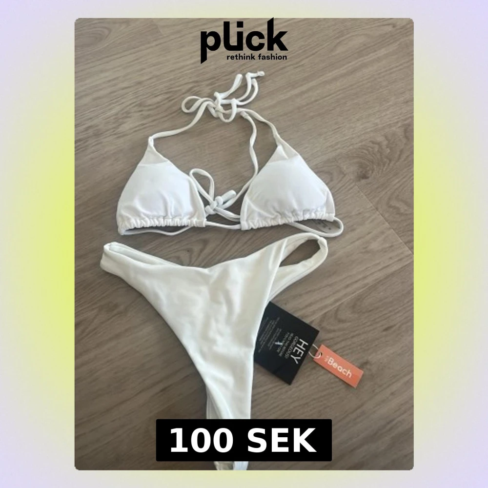 Säljer denna vita bikini. Trosorna är helt oanvända med lappen kvar i storlek XS (passar även s). Toppen är i storlek M men är liten i storlek så passar XS/S, använd en gång och tvättad.