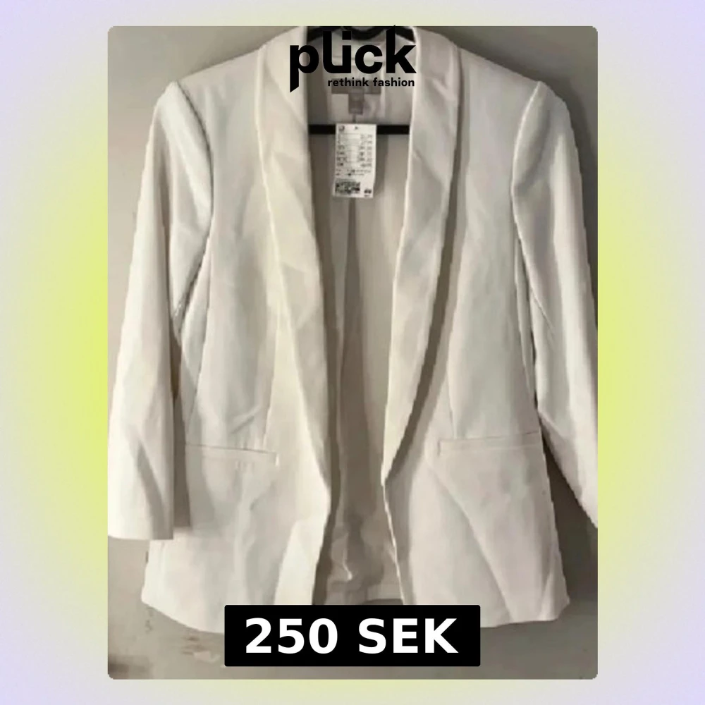 Stilren vit kavaj från H&M med sjalkrage och två fickor framtill. Kavajen har en rak passform och är tillverkad i ett slätt tyg som ger en elegant look. Perfekt för att lyfta vilken outfit som helst. Helt ny oanvänd med prislapp kvar! Vet inte varför bilderna blev så suddiga men det är iallafall en vit och väldigt basic kavaj:)