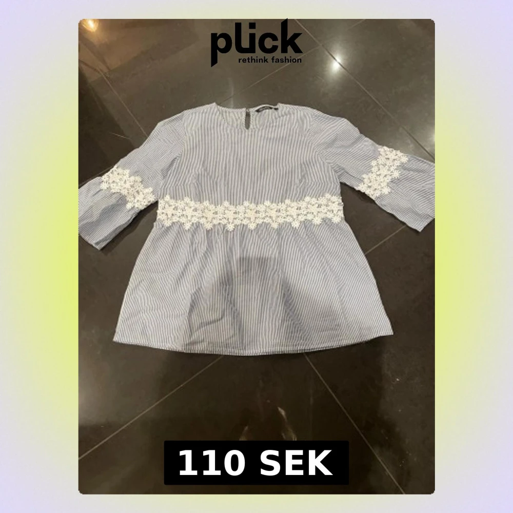 Snygg blus med tunna blå och vita ränder samt vita spetsdetaljer i midjan och på ärmarna. Blusen har trekvartsärm och en avslappnad passform. Perfekt till jeans eller kjol för en trendig look.
