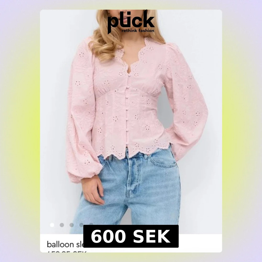 Söt ljusrosa blus med broderade blommor och åtsittande midja. Blusen har ballongformade lång puffärmar, knappar framtill och vågig kant nedtill. Helt slutsåld på hemsidan. Oanvänd med prislapp 600kr