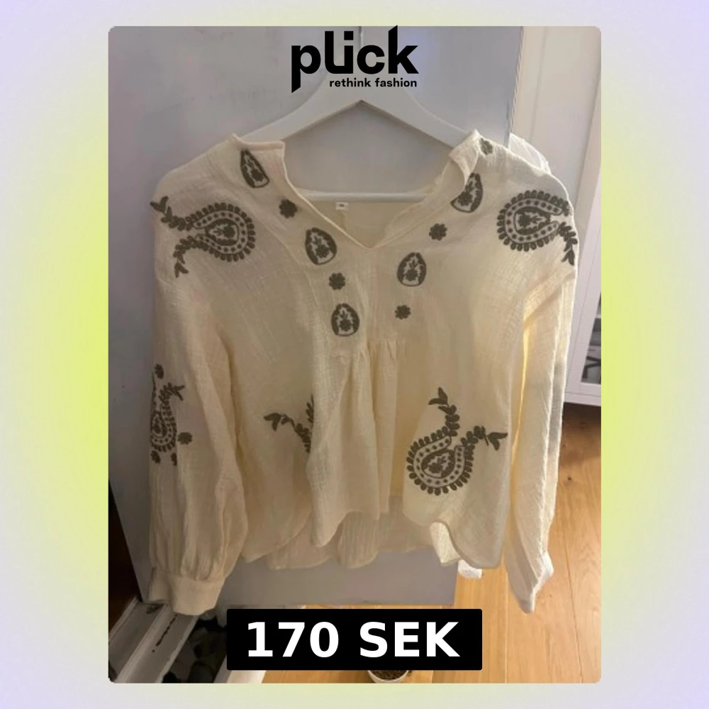 Luftig beige blus med gröna paisleyinspirerade broderier och v-ringning. Köpt på marknad utomlands så vet inte vart den är ifrån. Endast använd 1 gång säljer då jag inte använde den. Pris kan diskuteras vid snabb affär. Skriv till mig vid minsta fråga.