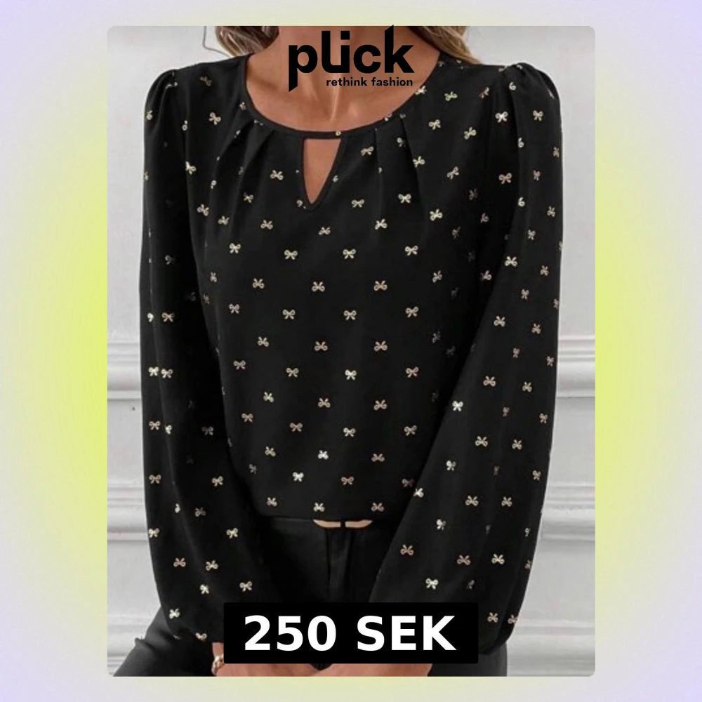 Snygg svart blus med små guldfärgade rosetter över hela tyget. Blusen har rund halsringning med en liten nyckelhålsöppning framtill och långa puffiga ärmar med resår vid handlederna. Tillverkad i ett lätt, flytande material som ger en elegant look.