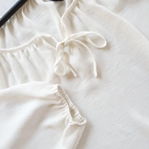 Vit blus med v-ringning och struktur - Snygg vit blus med djup v-ringning och markerad midja. Blusen har trekvartsärmar och ett strukturerat, lätt transparent tyg med diskret rutmönster. Perfekt att styla med jeans eller kjol för en trendig look.
