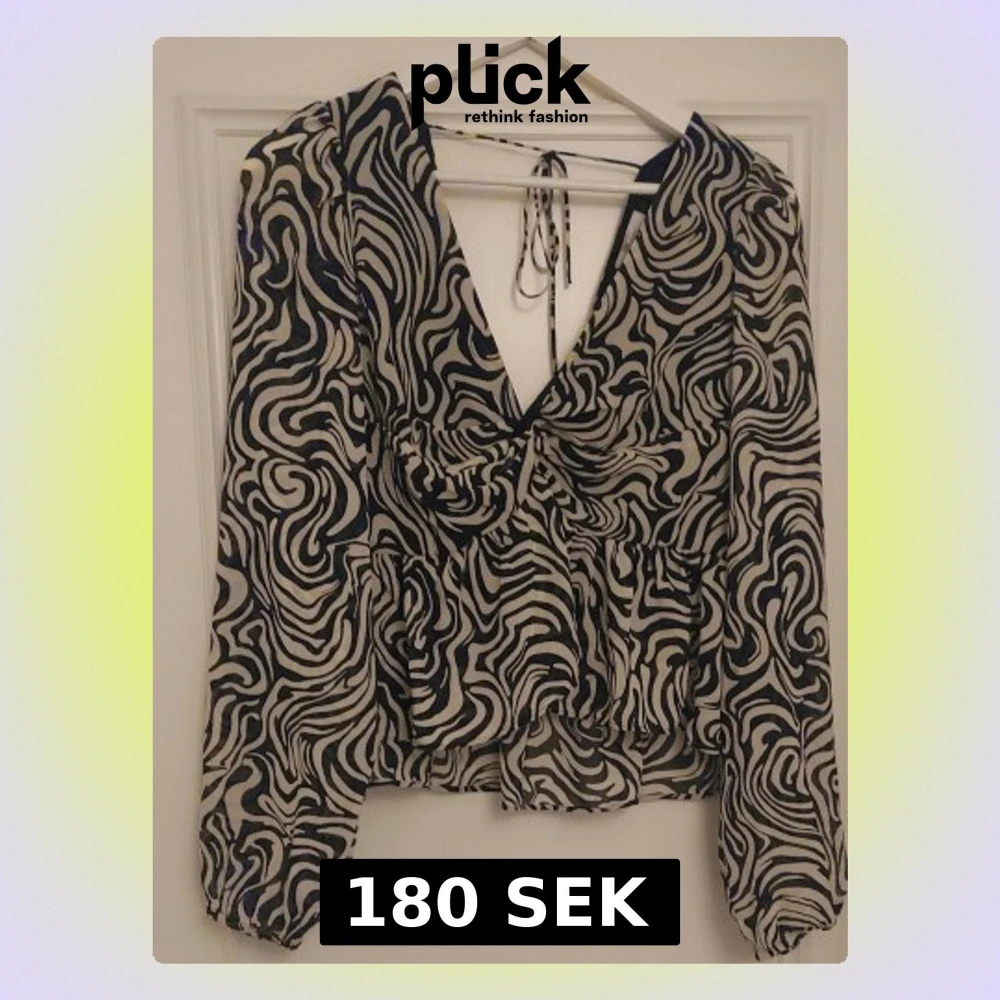 Trendig blus med svartvitt abstrakt mönster, djup v-ringning och knytband i nacken. Långa puffärmar med resår vid ärmslut och volang nedtill. Tunn och luftig i materialet, perfekt för att sticka ut i mängden.
