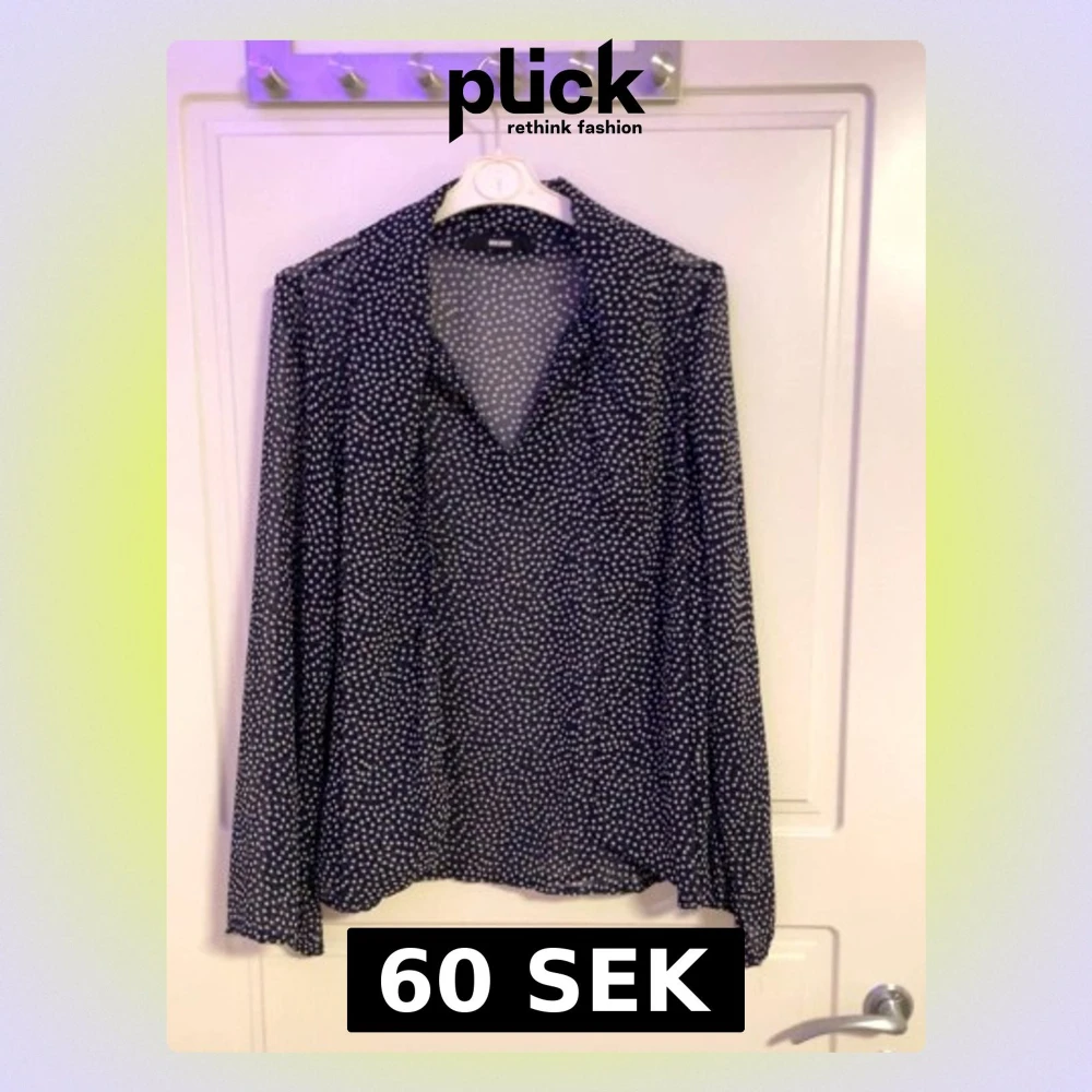 Snygg svart blus med vita prickar från H&M. Blusen har v-ringning och långa ärmar. Tunt, lätt och luftigt material som ger en avslappnad känsla. Perfekt att styla med jeans eller kjol för en trendig look.