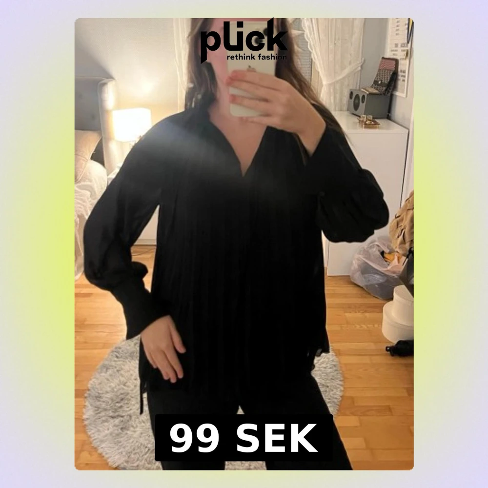 Snygg svart blus med plisserade detaljer och v-ringning. Blusen har långa ärmar med breda muddar och är tillverkad i ett lätt, något transparent tyg som ger en luftig känsla. Perfekt att styla med jeans eller kjol.