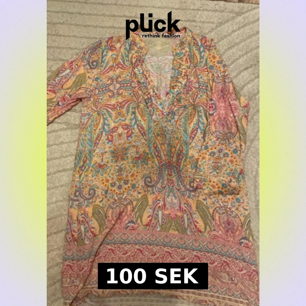 Säljer en tunn och luftig blus med färgglatt paisleymönster i rosa, turkos, gult och orange. Blusen har v-ringning med små volangdetaljer och knappar framtill. Materialet känns lätt och flowy, perfekt för varma dagar. Ingen synlig logga eller märke. Söndring märkeslapp går enkelt att fixa.