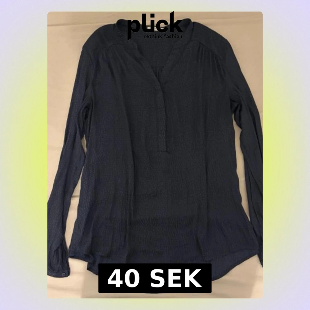 Stilren mörkblå blus från Promod med diskret mönster och v-ringad hals. Blusen har långa ärmar och är tillverkad i ett lätt, luftigt tyg som ger en avslappnad men ändå chic look. Perfekt att matcha med jeans eller kjol.