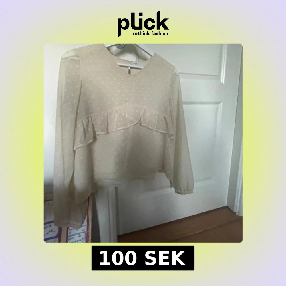 Beställde i fel storlek och har hängt i min garderob i två veckor. Fin volang, små prickar på och lite tunnare material i ärmarna.Köpt för 450 kr