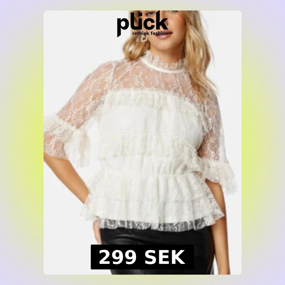 Säljer en vit blus i spets med volanger och transparenta detaljer. Blusen har trekvartsärm och hög krage, perfekt för dig som gillar romantisk och trendig stil. Materialet är lätt och luftigt, och ger en elegant look.