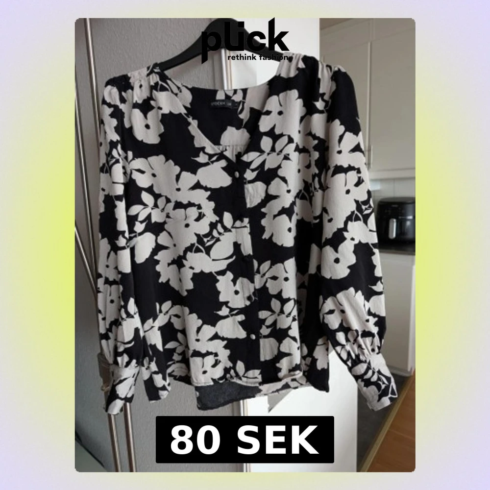 Snygg blus med svart botten och vita blommönster från Stockh LM. Blusen har v-ringning, knappar framtill och långa ärmar med knäppning vid mudden. Materialet är lätt och luftigt, perfekt för att skapa en cool och trendig look.
