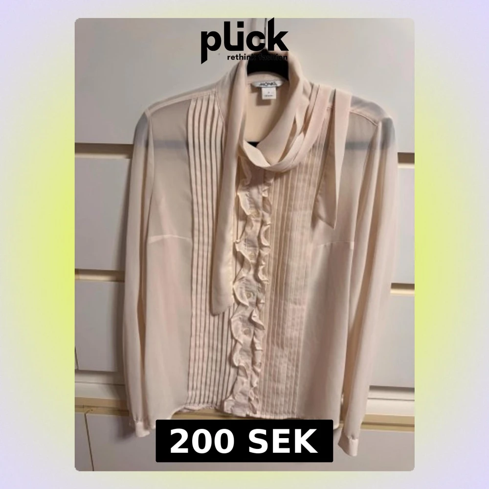 Elegant krämvit blus från MONKI med långa ärmar, knytband i halsen och dekorativa volanger samt veck framtill. Tillverkad i ett tunt, lätt material som ger en luftig känsla. Perfekt för en chic och stilren look.