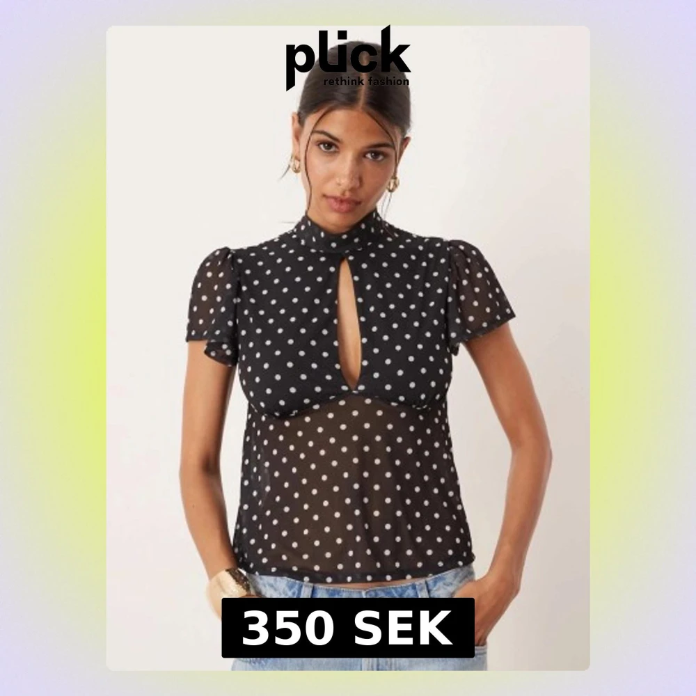 SLUTSÅLD HOS ASOS!!!! Trendig svart blus med vita prickar, transparent material och korta puffärmar. Hög hals med nyckelhålsöppning framtill och knytband i nacken. Perfekt att styla med jeans för en cool look. Köpte två storlekar och orkar inte returnera utan säljer hellre vidare då den ändå är slutsåld hos ASOS.