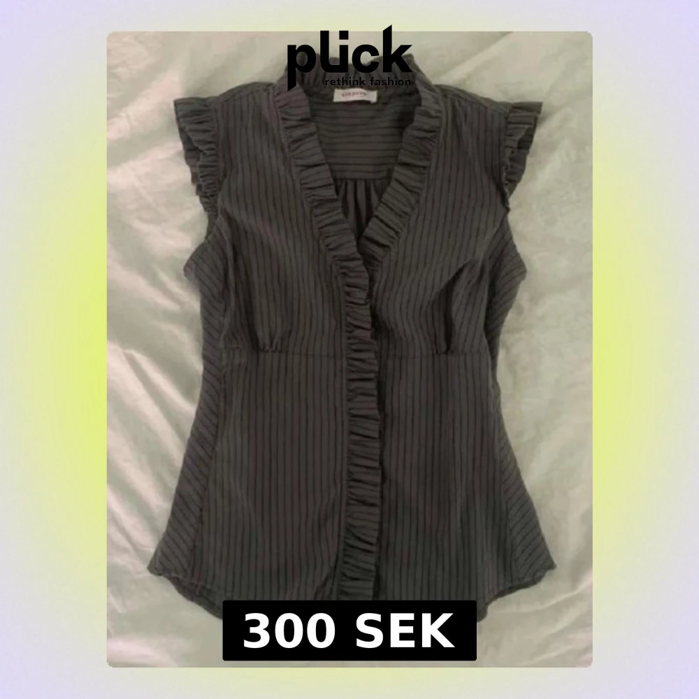 Säljer en grå blus från Object med tunna vertikala ränder och volangdetaljer längs krage och ärmslut. Blusen är ärmlös och har en feminin v-ringad omlottfront med volangkant. Perfekt för dig som gillar stilrena detaljer och snygg passform.