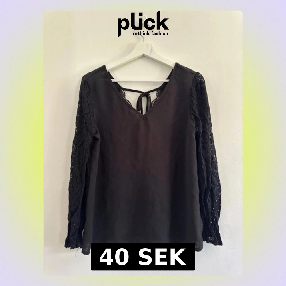 Stilren svart blus med långa spetsärmar och v-ringning både fram och bak. Blusen har dekorativ knytning i nacken och spetsdetaljer vid ringningen. Perfekt för dig som gillar en elegant men enkel look. Materialet känns lätt och luftigt.